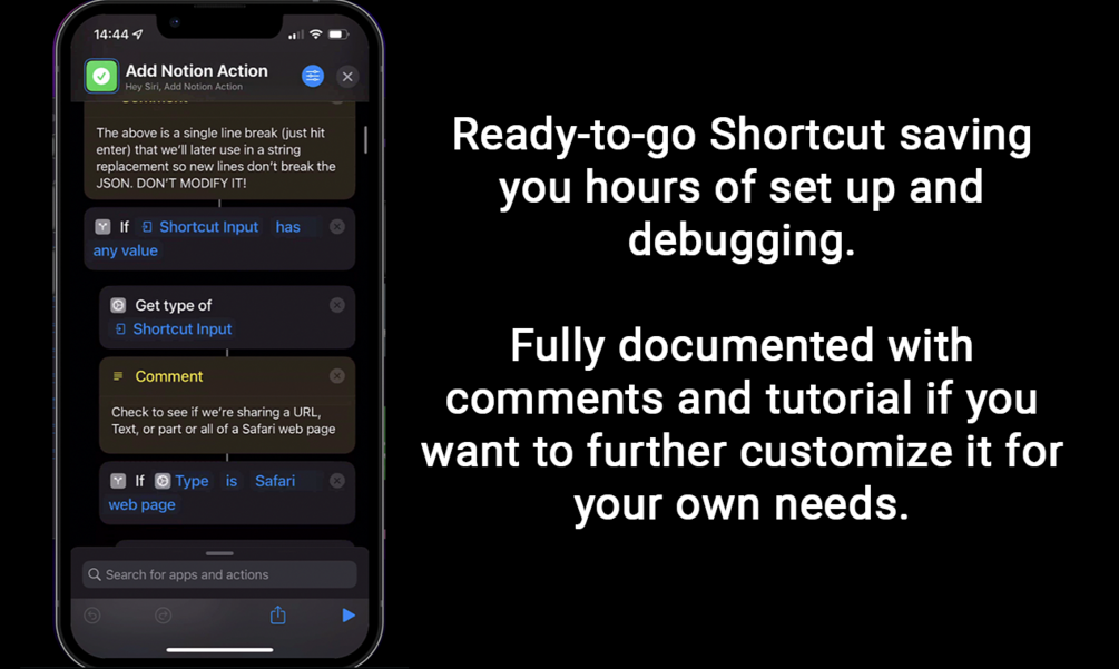 This package comes with the ready-to-use Shortcut, configuration instructions, and a detailed tutorial of how the basics work in case you're interested in learning more about configuring your own solution.
